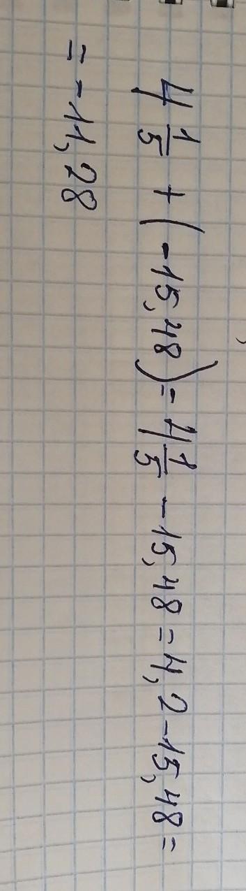 4 1/5+(-15 48/100)= 4 20/100-15 48/100= -11 28/100= -11.28