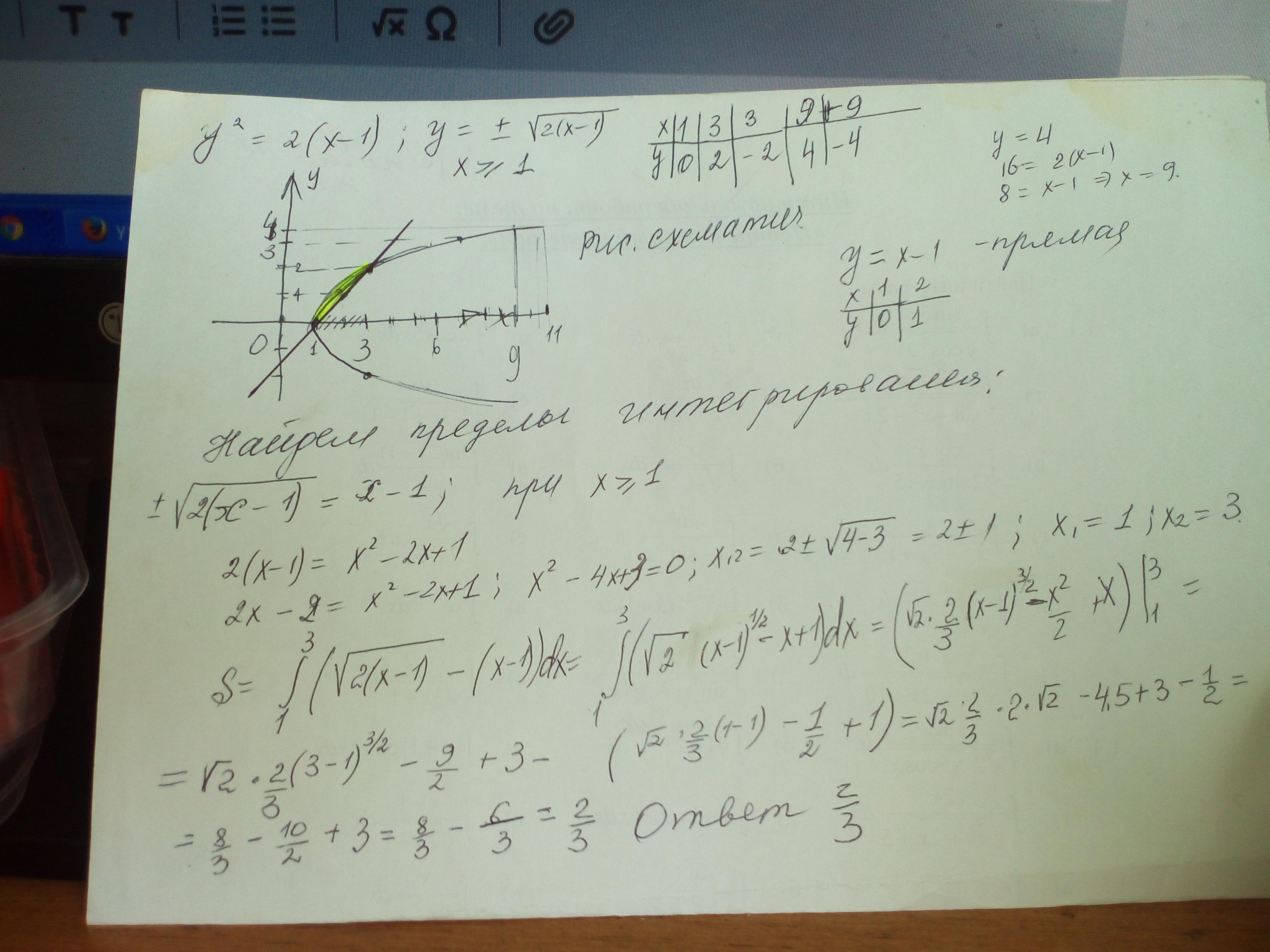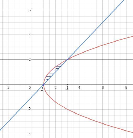 y^2=2(x-1) и y=x-1 Вычислить площадь фигуры ограниченной линиями