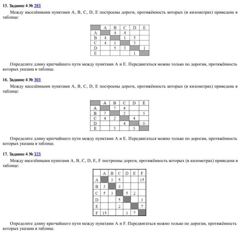 Все супер легко,в таблице смотришь что из А можно приехать в город B и C за 4км, потом из них в другие города и так просто подбираешь разные маршруты и смотришь какой из них короче, методом подбора, например в первой правильный ответ A -> C -> D -> E, так как он самый короткий из них, и составляет 8 км