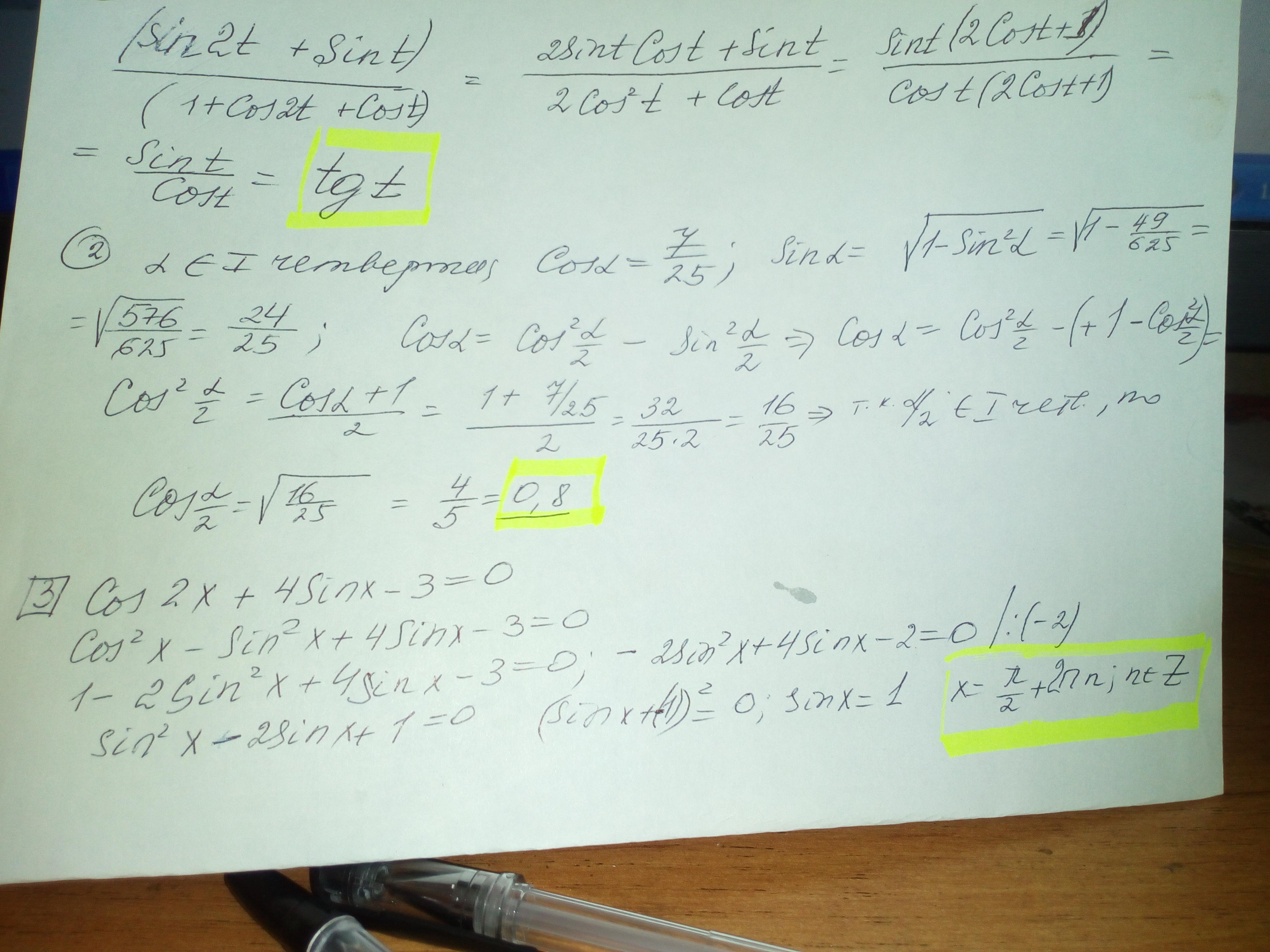 1)Упростить: (sin2t+sint)/ (1+cos2t+cost).