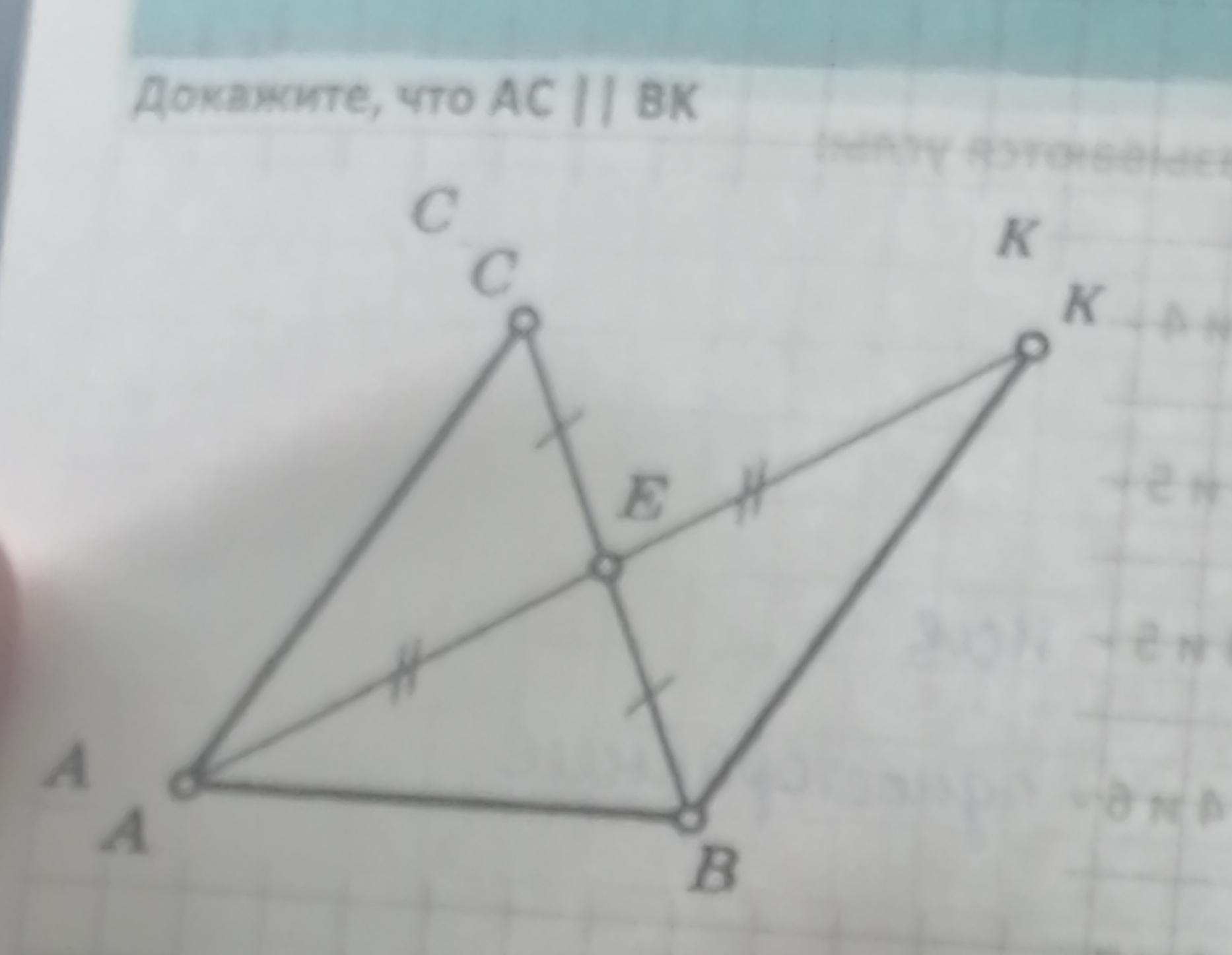 Оскільки трикутник ECA = EKB за двома сторонами і кутом між ними то AC II BK