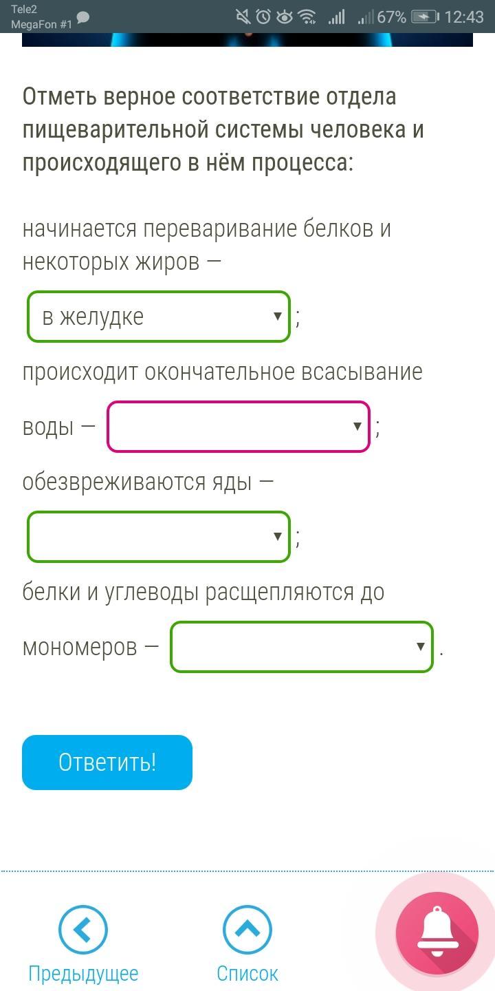 Отметь верное соответствие отдела пищеварительной системы человека и происходящего в нём процесса: