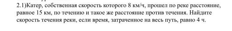 Пусть скорость течения х, тогда скорость по течению (8+х), против - (8-х). по течению он плыл 15 / (8+х) - часов, а против - 15 / (8-х). В сумме: 15 / (8+x) + 15 / (8-x) = 4 1 / (8+x) + 1 / (8-x) = 4/15 [8-x+8+x] / [(8+x) (8-x)]=4/15 16:15 = 4 * (8+x) (8-x) 60 = (8+x) (8-x) = 64-×*2 4-x 2 = 0 x = ±2 так как х>О, то х=2 км/ч - скорость течения