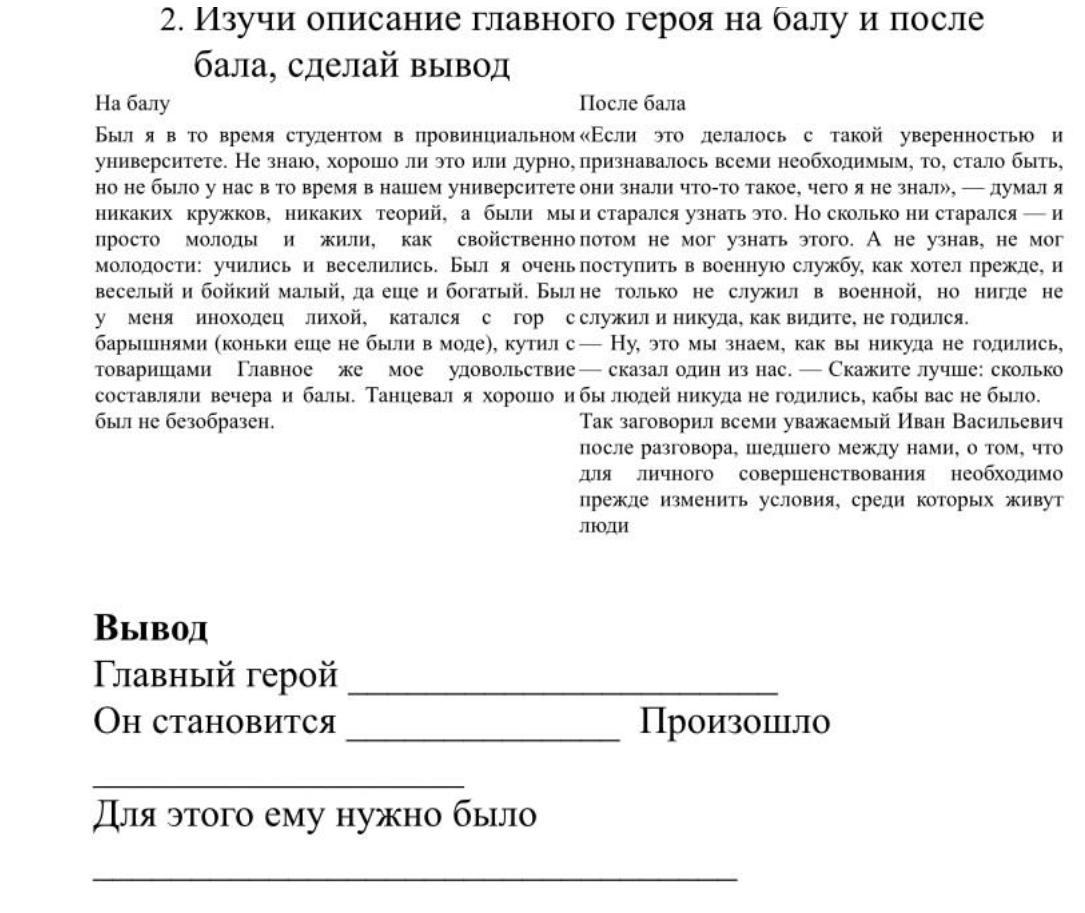 Изучи описание главного героя на балу и после бала, сделайте вывод!