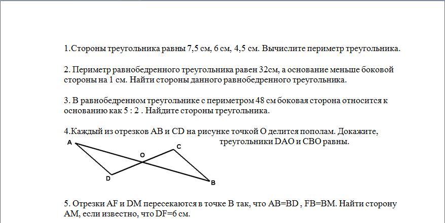 1) 18 см 2)10см 11см 11см 3)8см 20см 20см 4) Углы аод и сов равны т.к. вертикальные, от сюда следует треугольники дао и сво равны по 1 признаку равентва треугольников