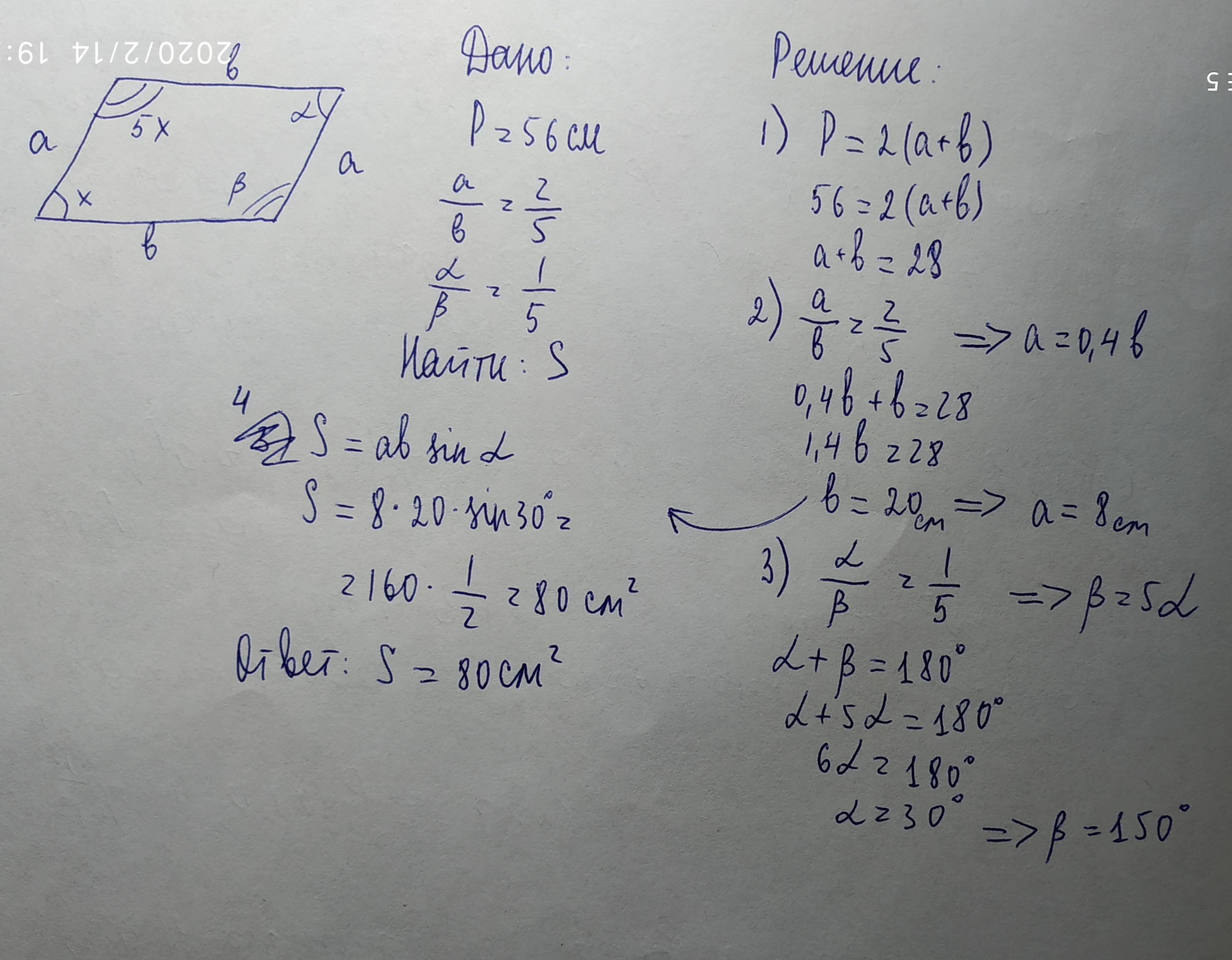 Периметр параллелограмма равен 56см . Два угла параллелограмма относятся как 1:5 ,а две стороны как 2:5. Найдите площадь этого параллелограмма (в см2)