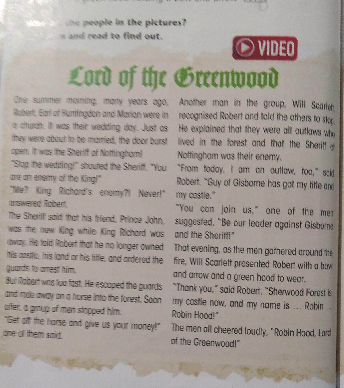 - Слезай с лошади и отдай нам свои деньги!- сказал один из них. Еще один человек в группе, Уилл Скарлетт, узнал Роберта и велел остальным остановиться. Он объяснил, что все они-разбойники, живущие в лесу, и что Шериф Ноттингема-их враг.