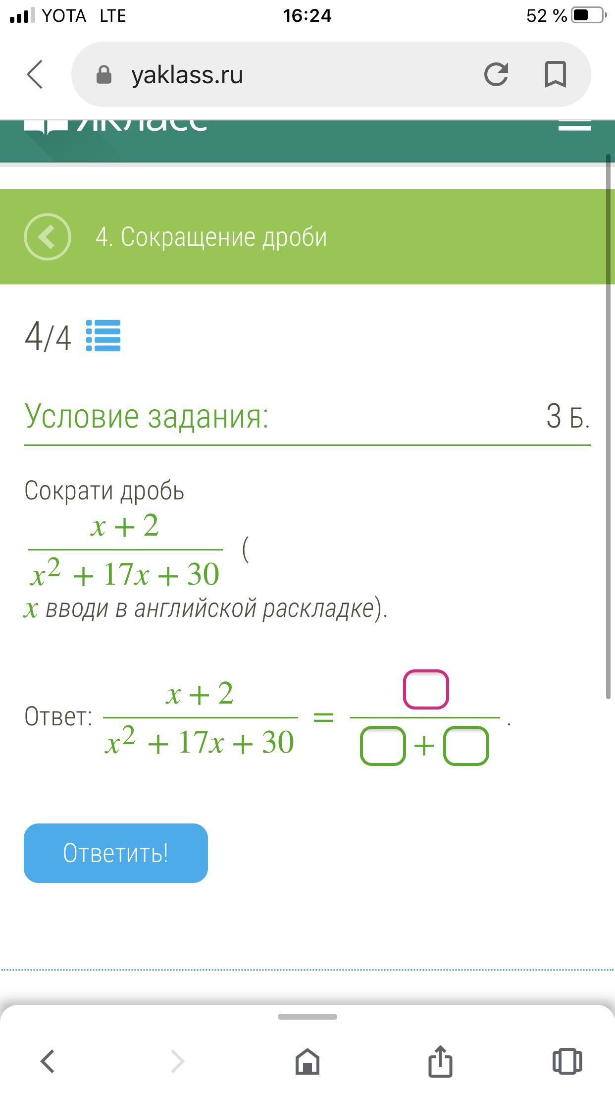 Ответ: х+2/(дробь)х в кв. + 17х +30=?/(дробь) ?+?
