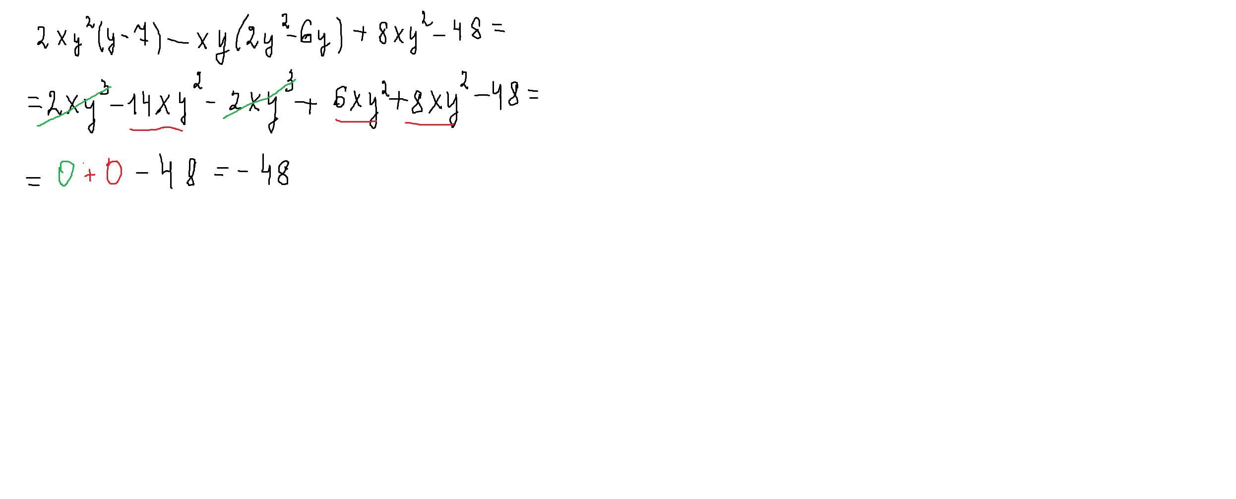 2xy^2 •(y-7)-xy(2y^2 -6y)+8xy^2 -48=2xy^2 •(y-7)-2xy^2 •(y-3)+8xy^2 -48=2xy^2 •(y-7-y+3)+8xy^2 -48=2xy^2 •(-4)+8xy^2 -48=-8xy^2 +8xy^2 -48=-48