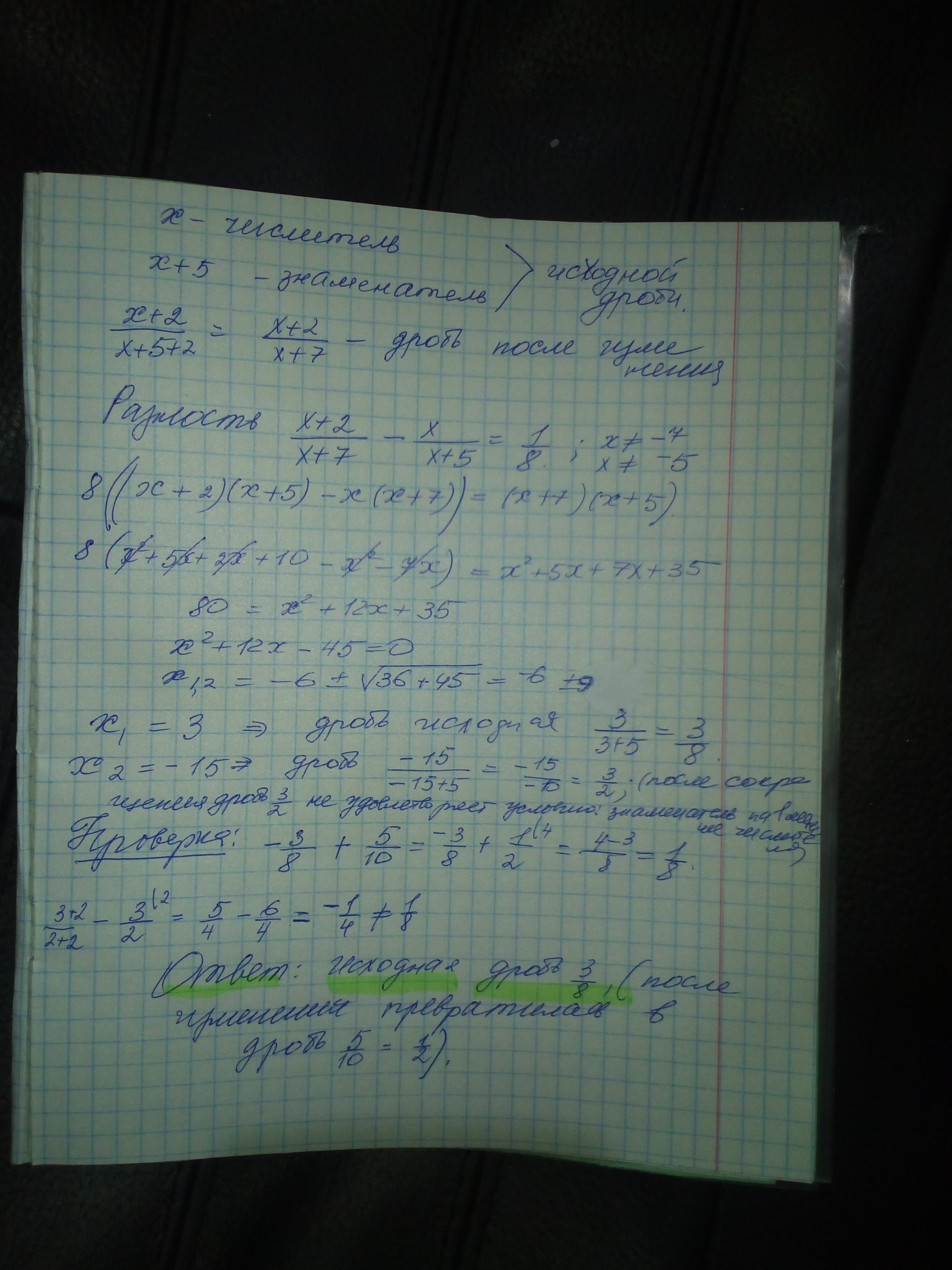 Знаменатель на 5 больше числитедя. Если и к числ и к знам прибавить 2 то дробь увеличится на 1/8 и найти надо дробь