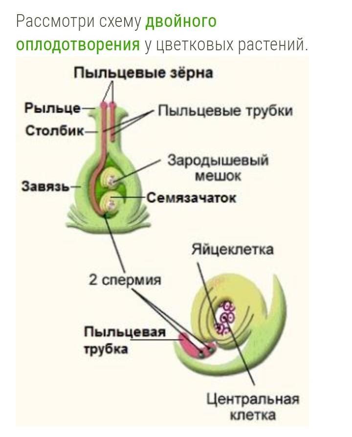 Определи, какие обозначения на рисунке соответствуют органам цветка, в котором происходит оплодотворение (обозначь их 1), а какие до оплодотворения принадлежали другому цветку (обозначь их 2).