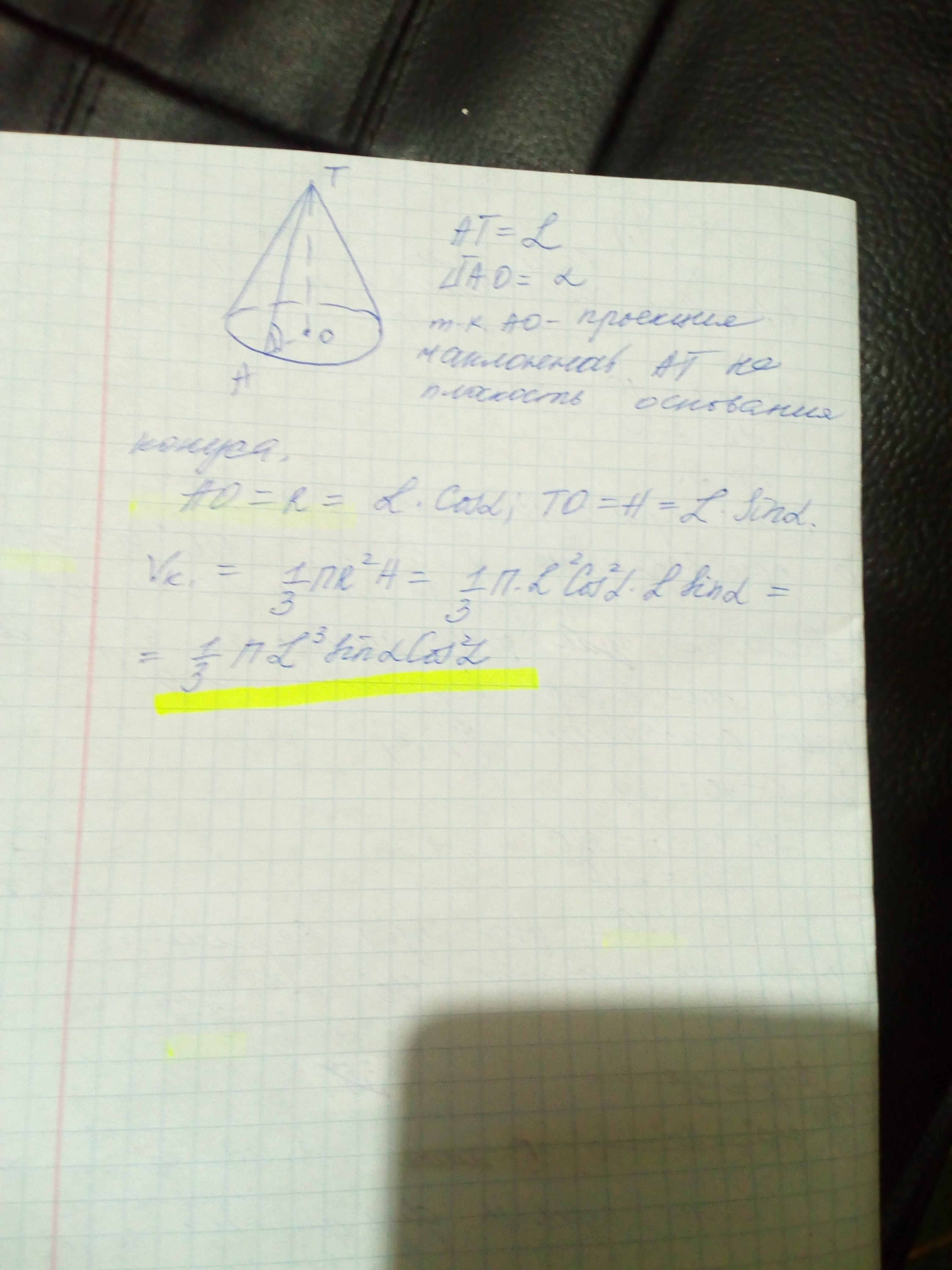 Образующая конуса равна L и наклонена к плоскости основания под углом a (альфа). найдите объем конуса. (с рисунком)