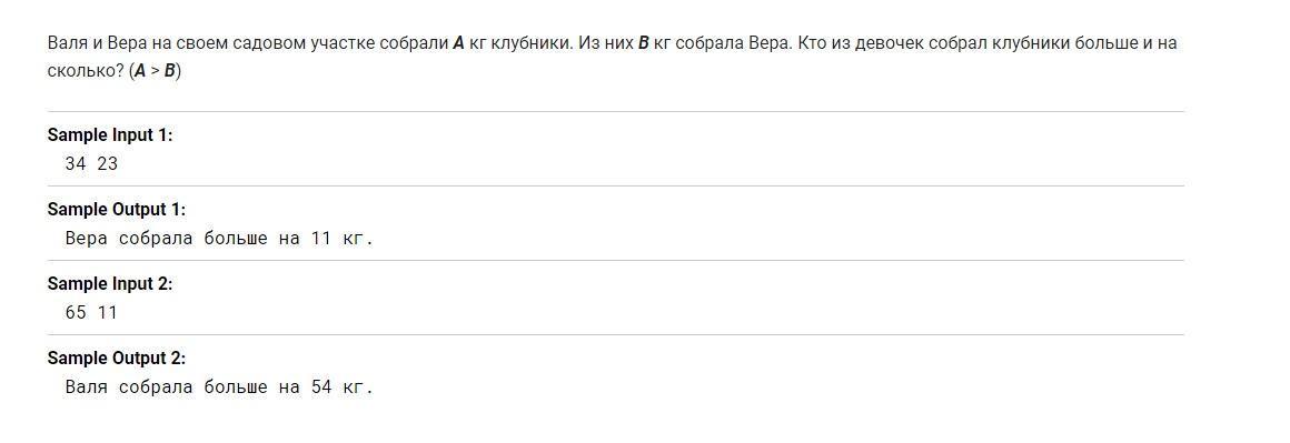 Валя и Вера на своем садовом участке собрали А кг клубники. Из них В кг собрала Вера. Кто из девочек собрал клубники больше и на сколько? (А > B) в паскале