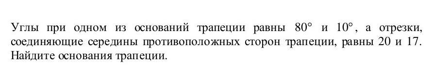 Дано: КМРТ - трапеция, ∠К=80°, ∠Т=10°, ЕС - средняя линия, ЕС=20 см, АВ=17 см, МА=АР, КВ=ВТ. Найти МР и КТ.