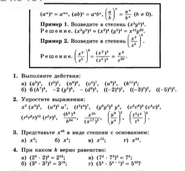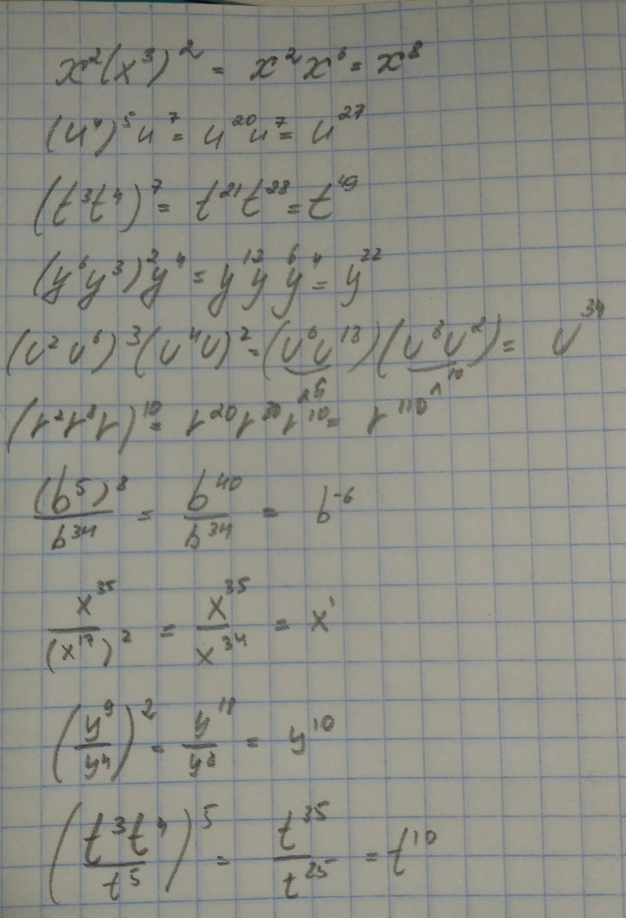 все очень просто же: степень в степень - умножаешь, умножение с одинаковым основанием - складываешь, деление с одинаковым основанием - вычитаешь степень