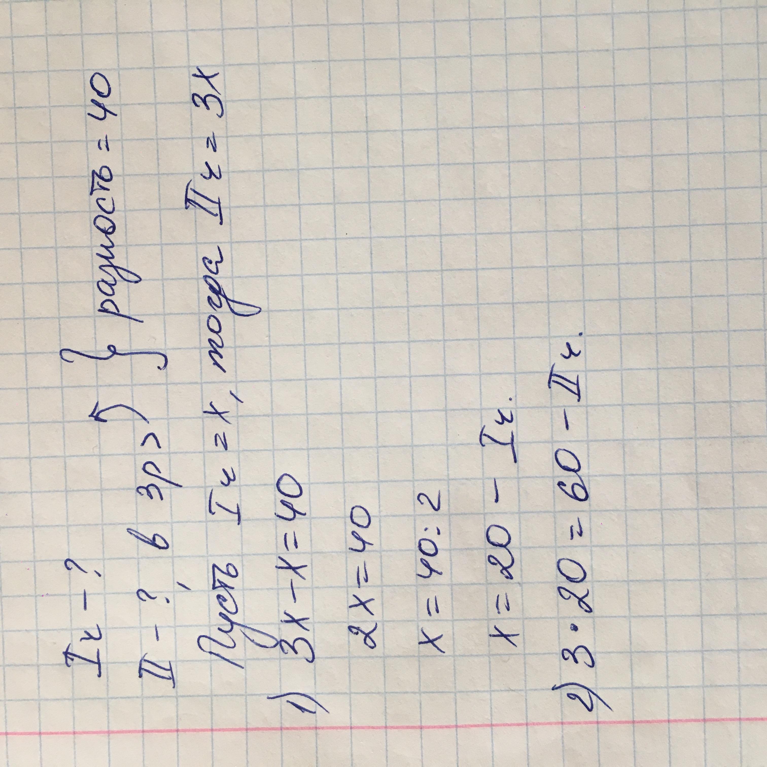 Одно из чисел в 3 раза больше другого а их разность равна40 найдите меньшее из чисел (текстовая задача)