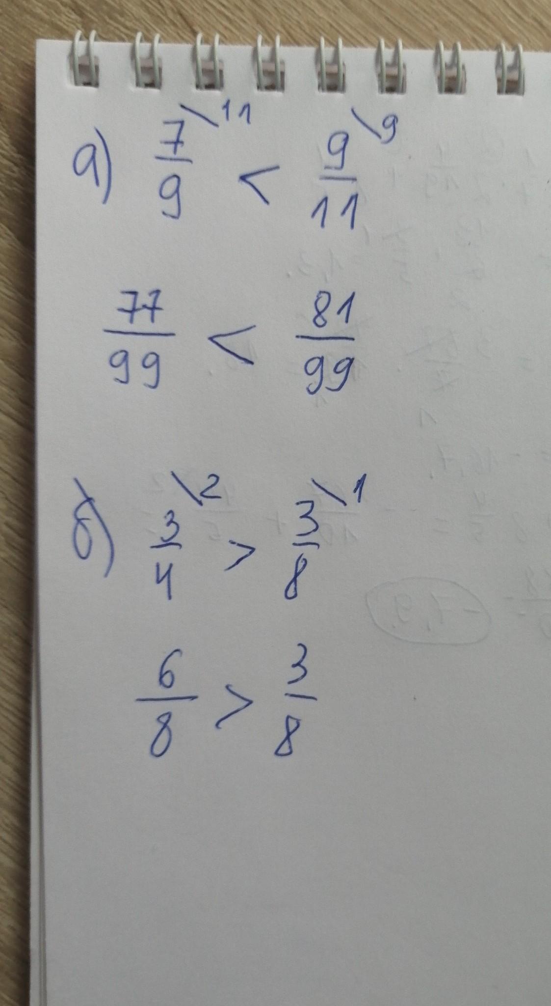 а) 7/9 и 9/11 = 77/99 < 81/99; б) 3/4 и 3/8 = 6/8 > 3/8