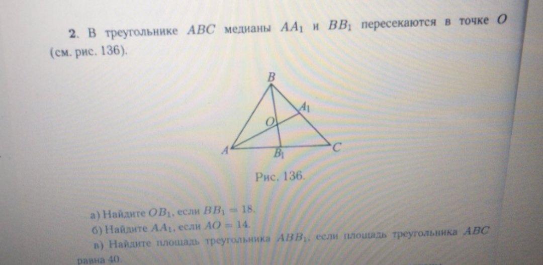 Площадь абс=40 бб1 это медиана а она делит прямую пополам а она исходит из вершины следует она делит треугольник пополам тогда площадь абб1 будет 20 так как 40:2=20