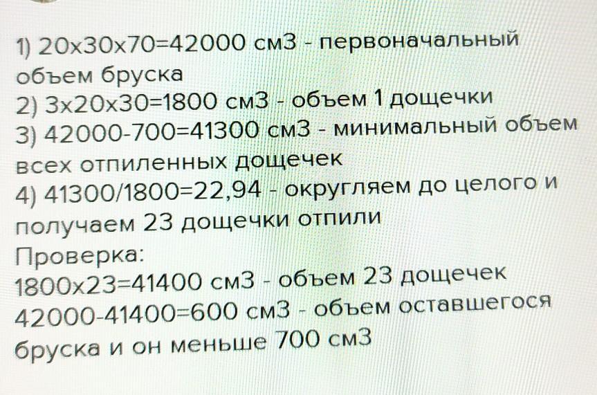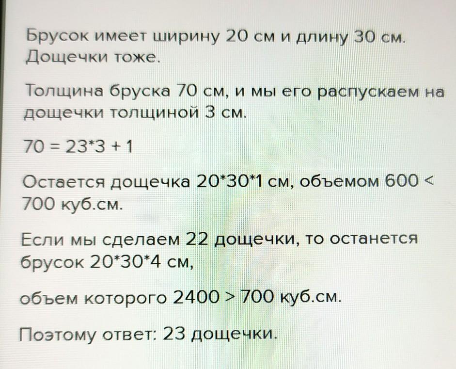 от деревянного бруска размером 30см*60см*100см отпилили несколько дощечек размером 3см*30см*60см. После этого остался брусок объёмом менее 2000см³. Сколько дощечек отпилили?
