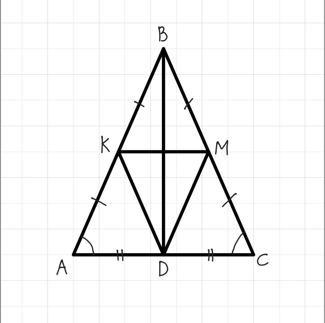 Дано: ΔABC - рівнобедрений, АВ=ВС, BD - медіана, К ∈ АВ, М ∈ ВС, АК=КВ, МС=МВ.