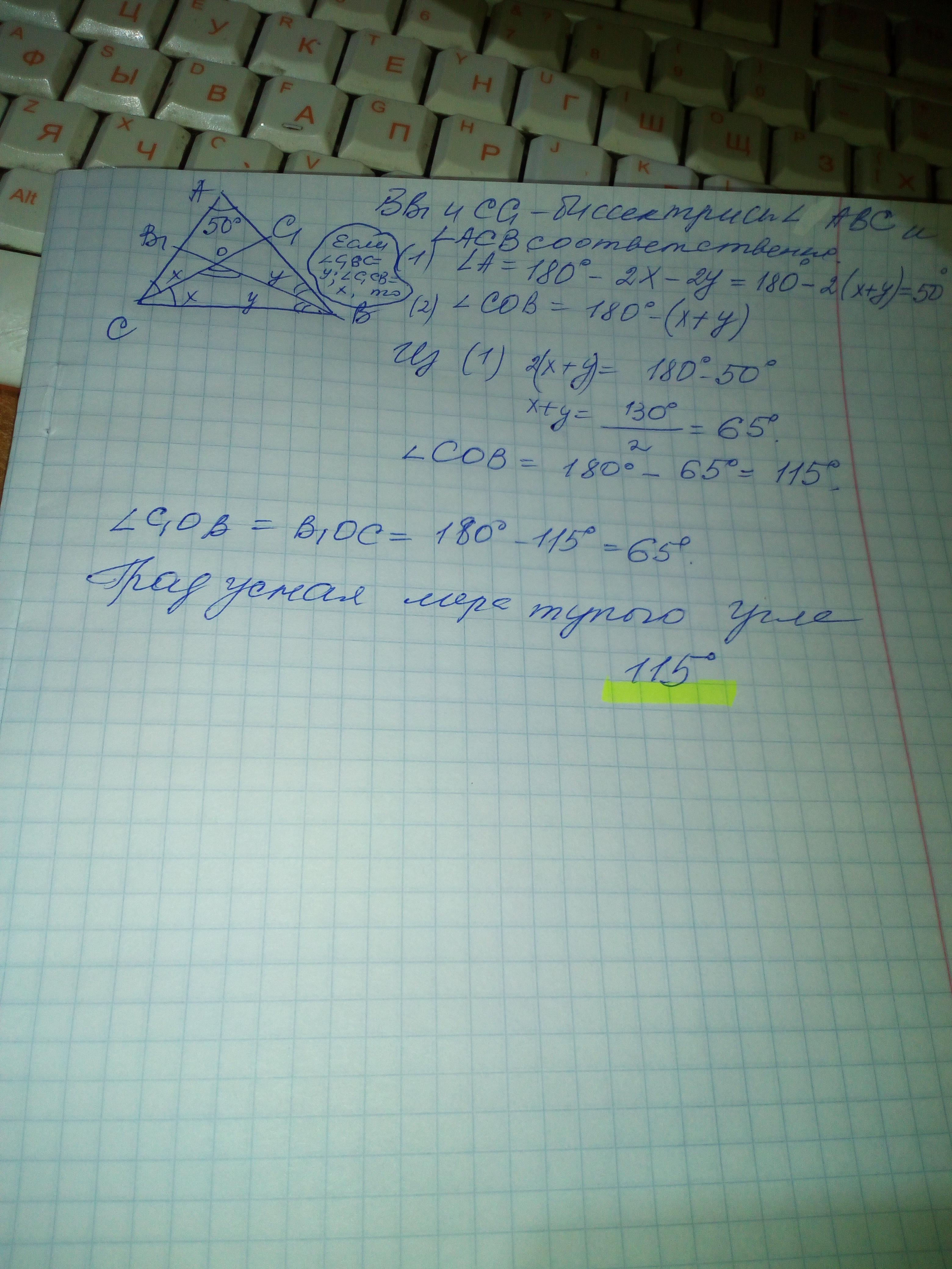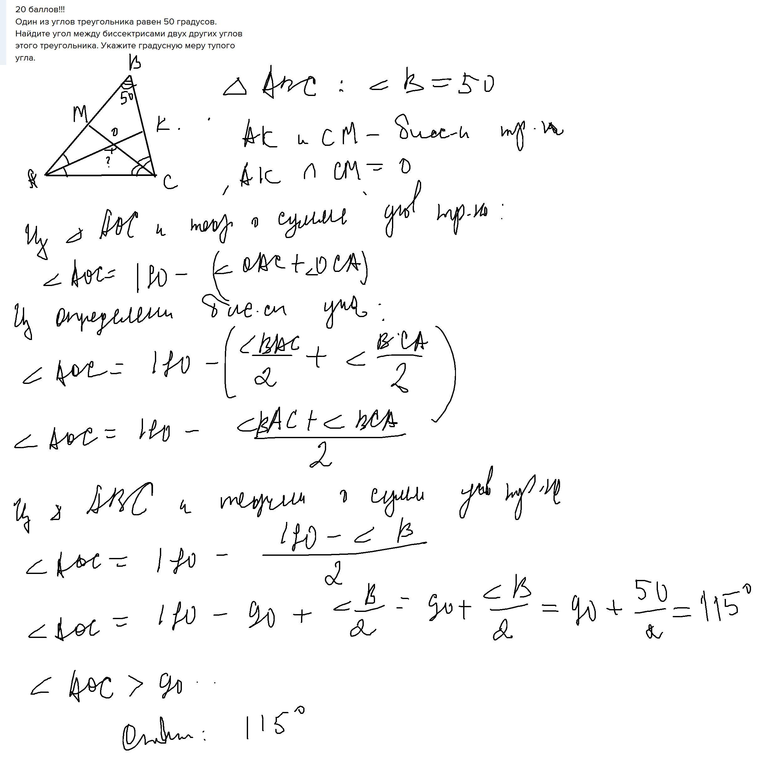 Один из углов треугольника равен 50 градусов. Найдите угол между биссектрисами двух других углов этого треугольника. Укажите градусную меру тупого угла.