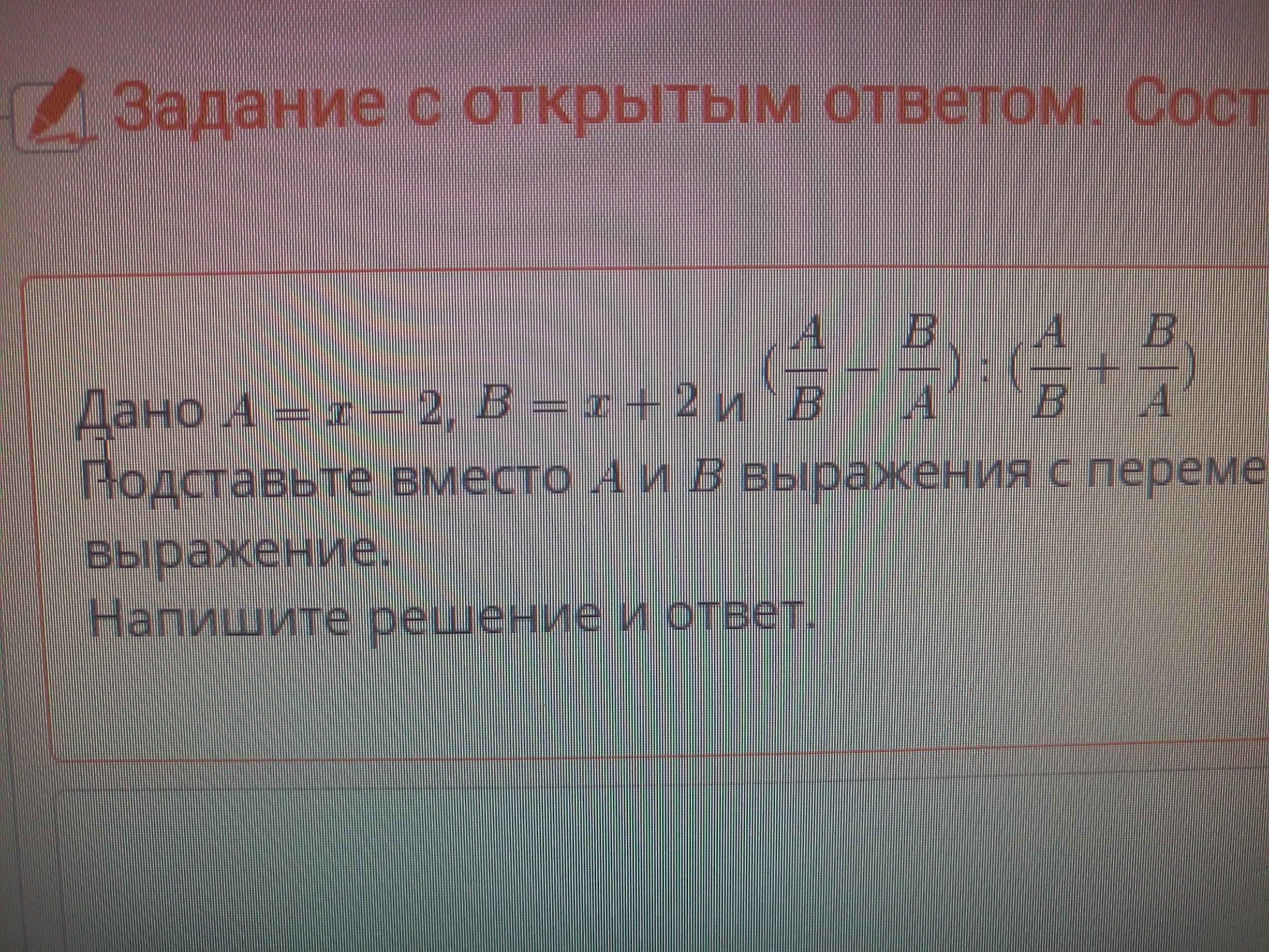 ((x-2)/(x+2) -(x+2)/(x-2))÷((x-2)/(x+2) +(x+2)/(x-2))=((x-2)^2 -(x+2)^2)/(x^2 -4) ÷((x-2)^2 +(x+2)^2)/(x^2 -4)=((x-2-x-2)(x-2+x+2))/(x^2 -4) •(x^2 -4)/(x^2 -4x+4+x^2+4x+4)=(-4•2x)/(2x^2 +8)=-(8x)/(2(x^2 +4))=-(4x)/(x^2 +4)