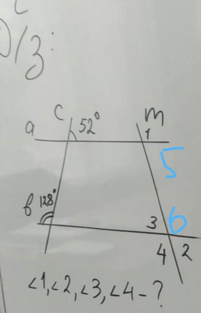 угол 5 =180-128=52 градуса(т.к смежный с углом 1)