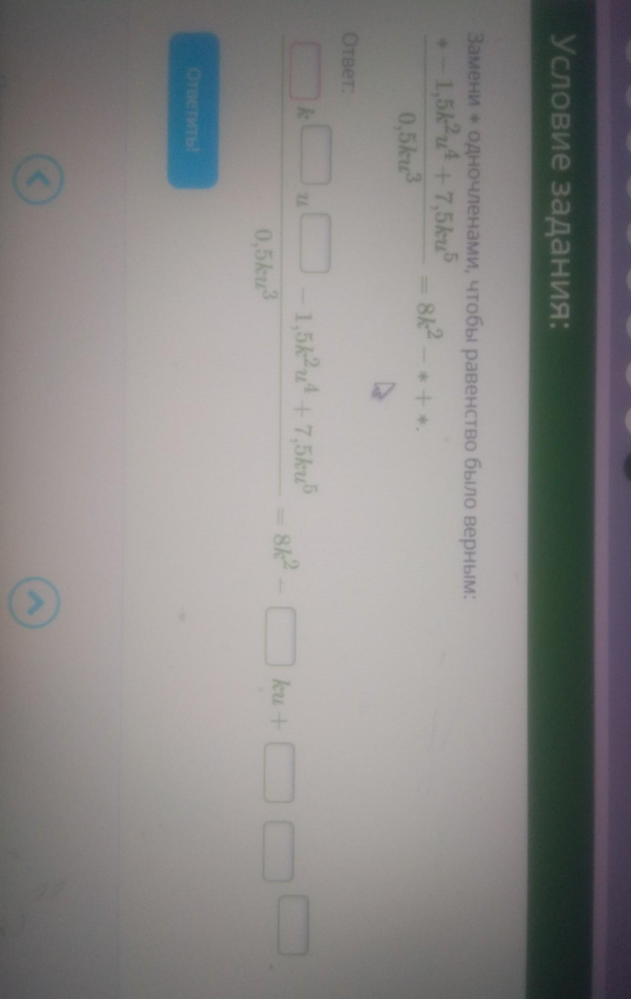 frac{(star )-1,5, k^2u^4+7,5, k, u^5}{0,5, k, u^3}=8, k^2-(star )+(star ); ; ; Rightarrow \\(star )-1,5, k^2, u^4+7,5, k, u^5=0,5, k, u^3cdot Big(8k^2-(star )+(star )big )\\underline {(star )}-underline {underline {1,5, k^2u^4}}+{underline {underline {underline{7,5ku^5}}}=underline {4k^3u^3}-underline {underline {(star )cdot 0,5ku^3}}+underline {underline {underline {(star )cdot 0,5ku^3}}}