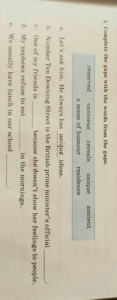 b. residence; c. reserved; d. cereals; e. canteens; f. ancient; g. sense of humour