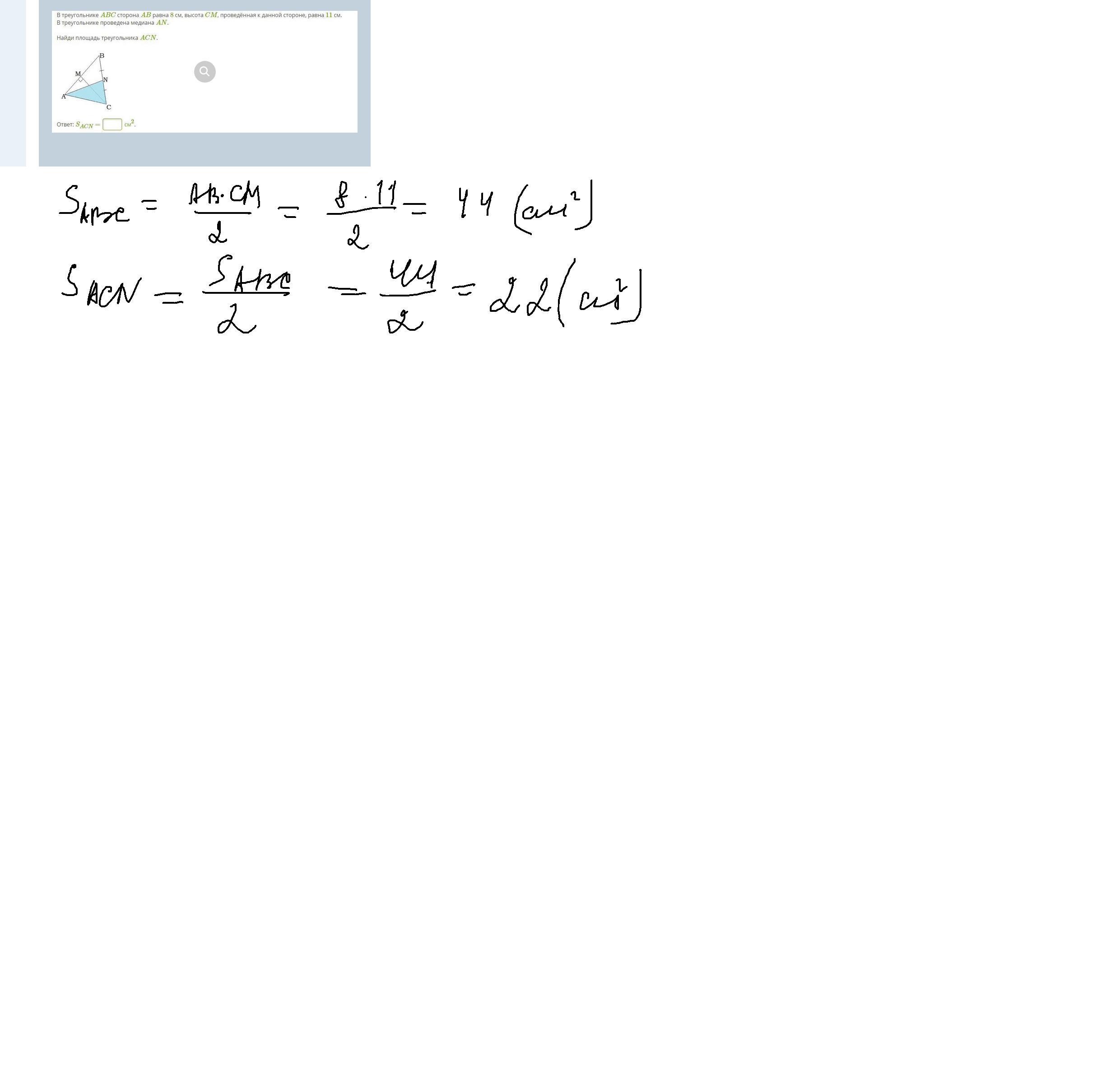 В треугольнике ABC сторона AB равна 8 см, высота CM, проведённая к данной стороне, равна 11 см. В треугольнике проведена медиана AN. Найди площадь треугольника ACN.  Ответ: SACN =  см2.