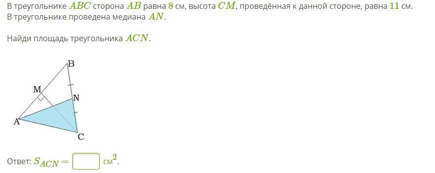 В треугольнике ABC сторона AB равна 8 см, высота CM, проведённая к данной стороне, равна 11 см. В треугольнике проведена медиана AN. Найди площадь треугольника ACN.  Ответ: SACN =  см2.