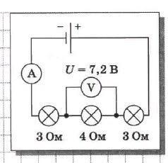 U=7,2В R=R¹+R²+R³=3+4+3=10 Ом