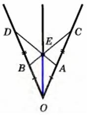 На рисунке: OA=OB; BD=AC. Точка E – точка пересечения прямых AD и BC. Докажите, что OE – биссектриса угла DOC.