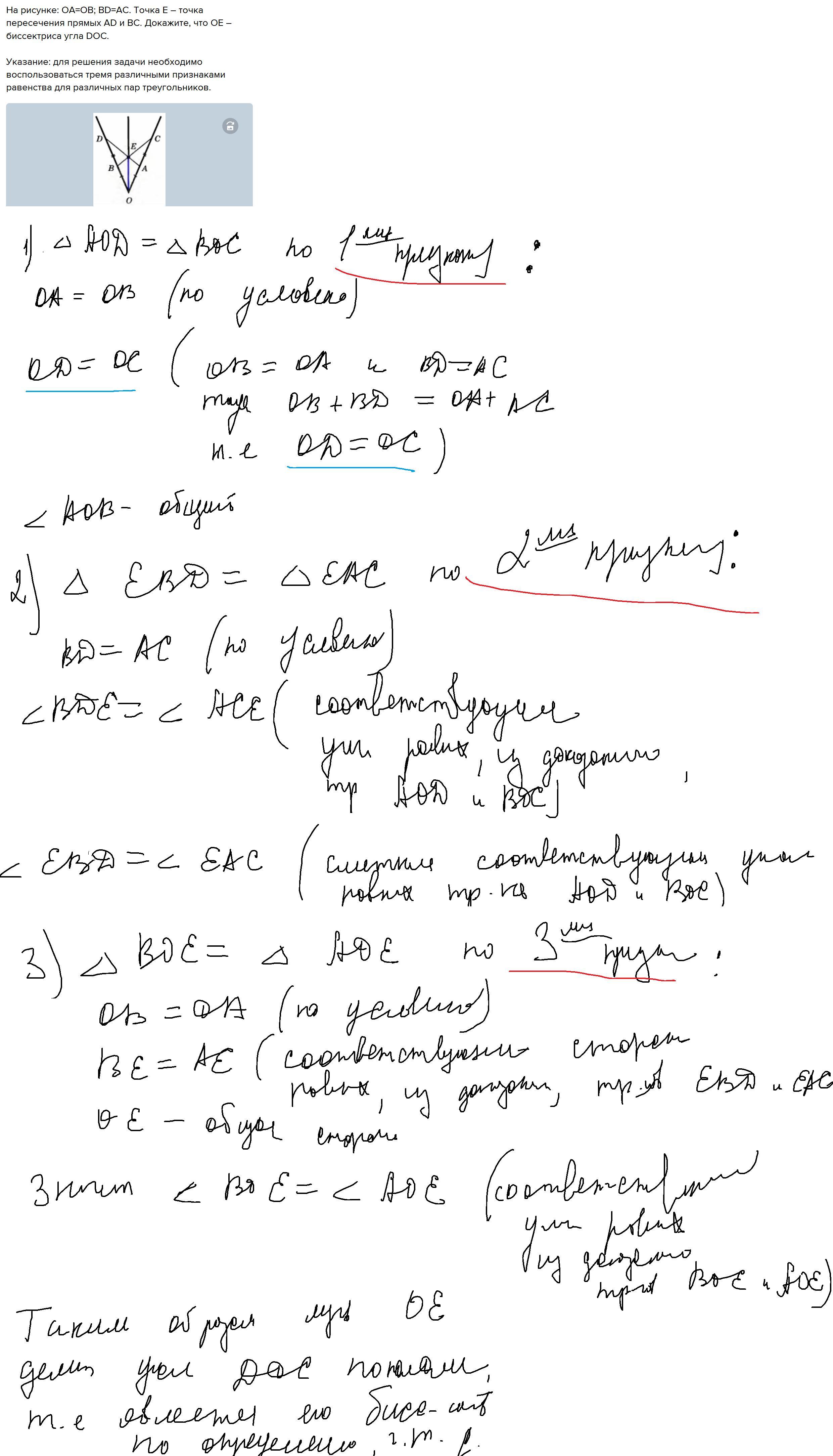 Указание: для решения задачи необходимо воспользоваться тремя различными признаками равенства для различных пар треугольников.