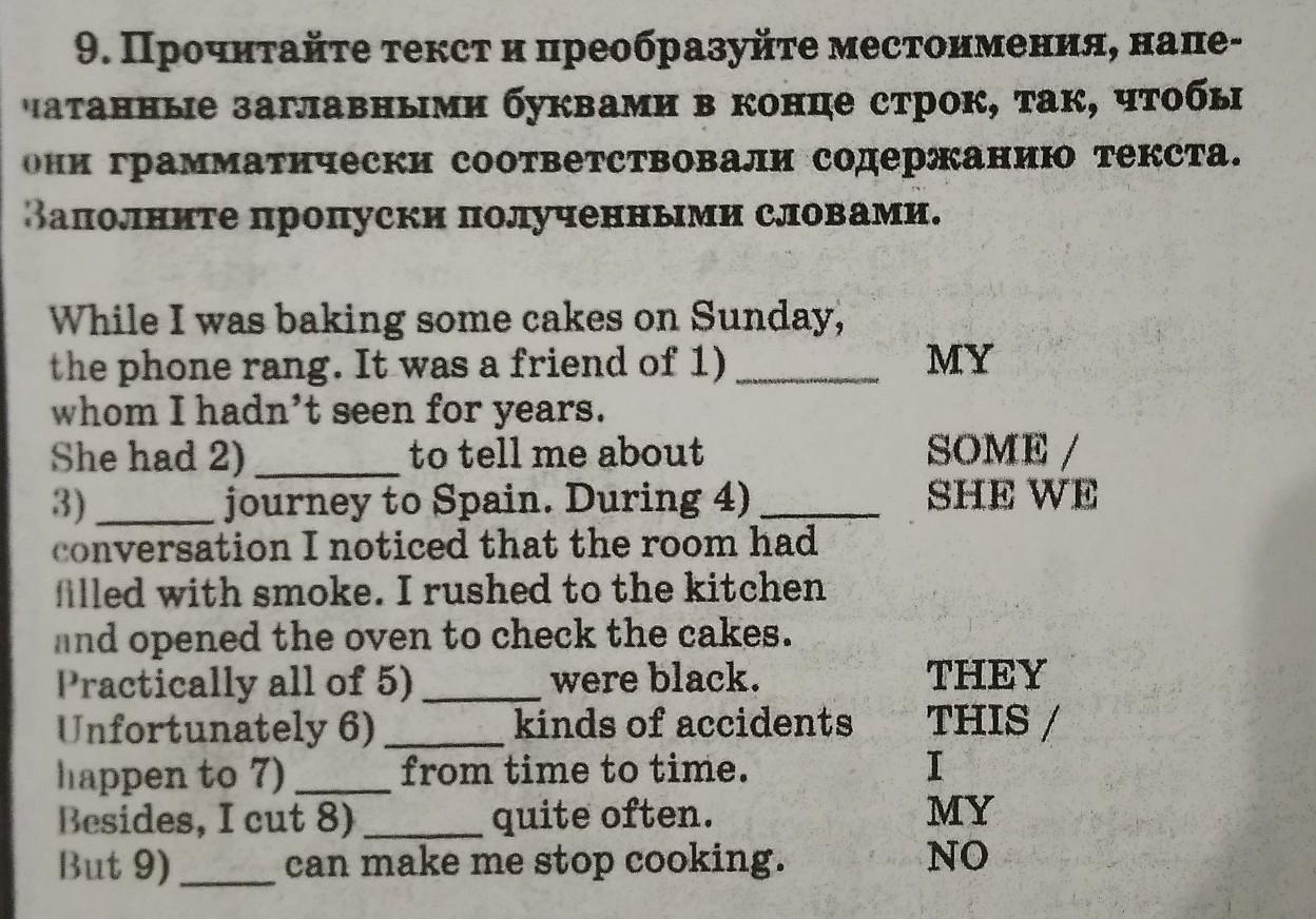 While I was baking some cakes on Sunday, the phone rang. It was a friend of 1) MINE whom I hadn't seen for years. She had 2) SOMETHING to tell me about 3) HER journey to Spain. During 4) OUR conversation I notices that the room had filled with smoke. I rushed to the kitchen and opened the oven to check the cakes. Practically all of 5) THEM were black. Unfortunately 6) THESE kinds of accidents happen to 7) ME from time to time. Besided, I cut 8) MYSELF quite often. But 9) NOBODY can make me stop cooking.