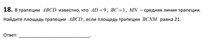 Объяснение:MN=(9+1):2=5, S BCNM=(BC+MN):2*h,где h-высота трапеции BCNM.