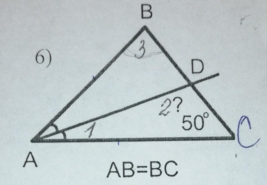 Объяснение: AB= BC => тр. ABC -равнобедренный а тогда угол А= углу С=50(градусам)=>угол 1=50/2=25(градусов)=> угол 2=180-(50+25)=105 (градусов), угол BDA, как смежный, равен 180-105=75, угол3= 180-(75+25)=80 градусов