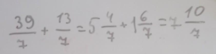 Пошаговое объяснение: 1) 26 / 7 + 13 / 7 = 39/ 7 2) 39 / 7 = 5 ( ост 4) 5 - целая часть 4 - остаток, а значит числитель 7- так и остается знаменателем