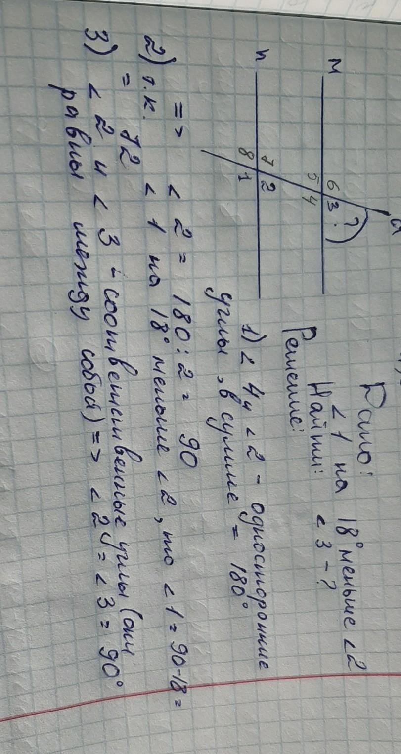 так как угол 1 меньше 2 на 18 градусов то 1=180/2-18=90-18=72 градуса