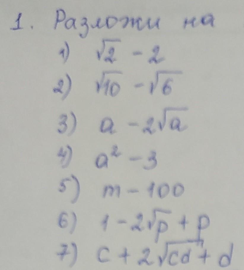 sqrt2-2=sqrt2, (1-sqrt2)\\sqrt{10}-sqrt6=sqrt{2}, (sqrt5-sqrt3)\\a-2sqrt{a}=sqrt{a}, (sqrt{a}-2)\\a^2-3=(sqrt{a}-sqrt3)(sqrt{a}+sqrt3)\\m-100=(sqrt{m}-10)(sqrt{m}+10)\\1-2sqrt{p}+p=(1-sqrt{p})^2\\c+2sqrt{cd}+d=(sqrt{c}+sqrt{d})^2