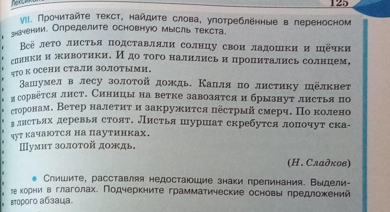 Зашумел(сказуемое) в лесу золотой дождь(подлежащее). Капля(подлежащее) по листику щёлкнет(сказуемое) и сорвётся(сказуемое) лист(подлежащее). Синицы(подлежащее) на ветке завозятся(сказуемое) и брызнут(сказуемое) листья(подлежащее) по сторонам. Ветер(подлежащее) налетит(сказуемое) и закружится(сказуемое) пёстрый смерч(подлежащее). По колено в листьях деревья(подлежащее) стоят(сказуемое). Листья(подлежащее) шуршат, скребутся, лопочут, скачут, качаются(однородные сказуемые) на паутинках.