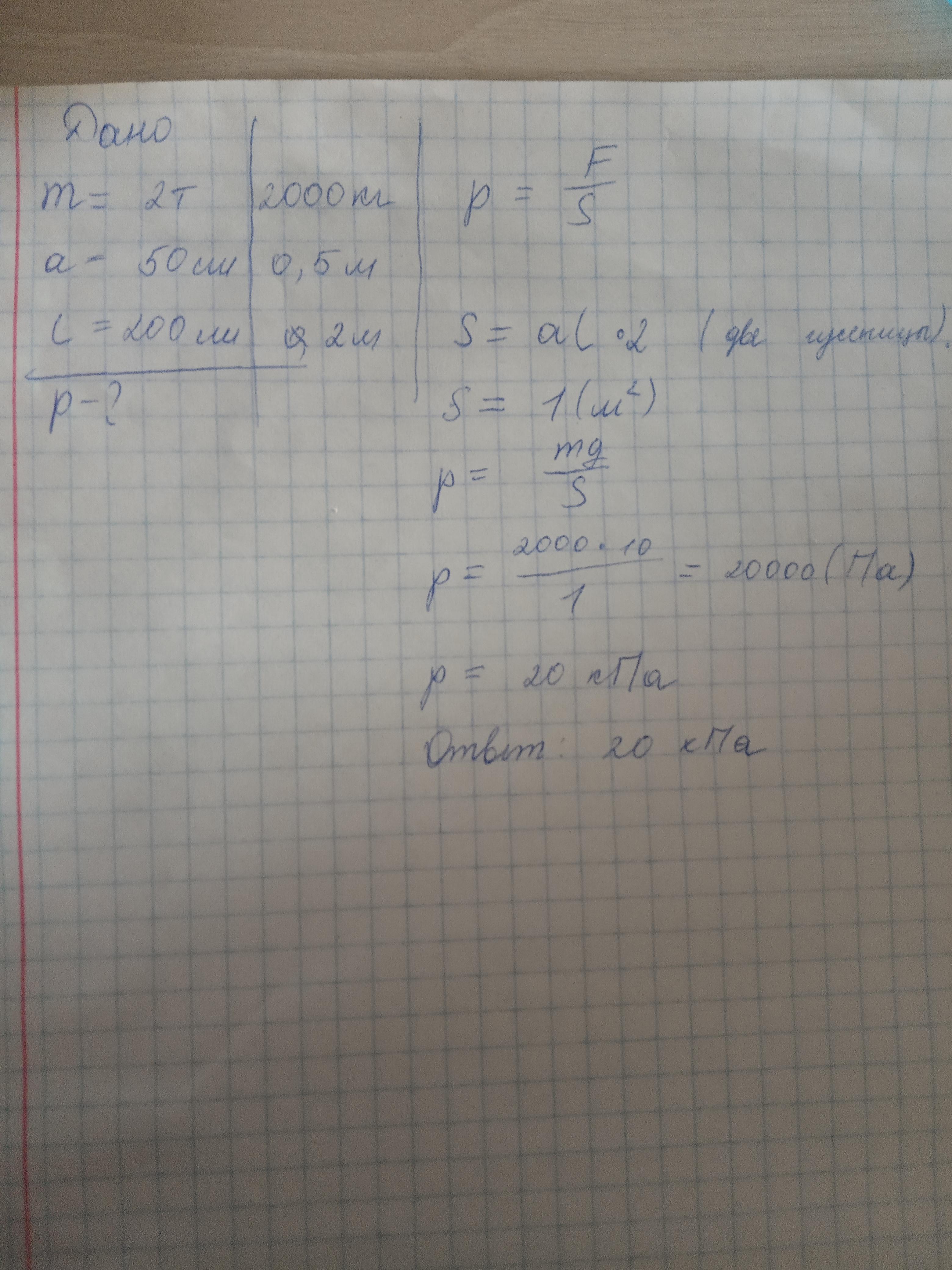 Трактор массой 2 тонны стоит на гусеницах. Ширина одной гусеницы 50 см, а длина 200 см. Найти давление трактора.