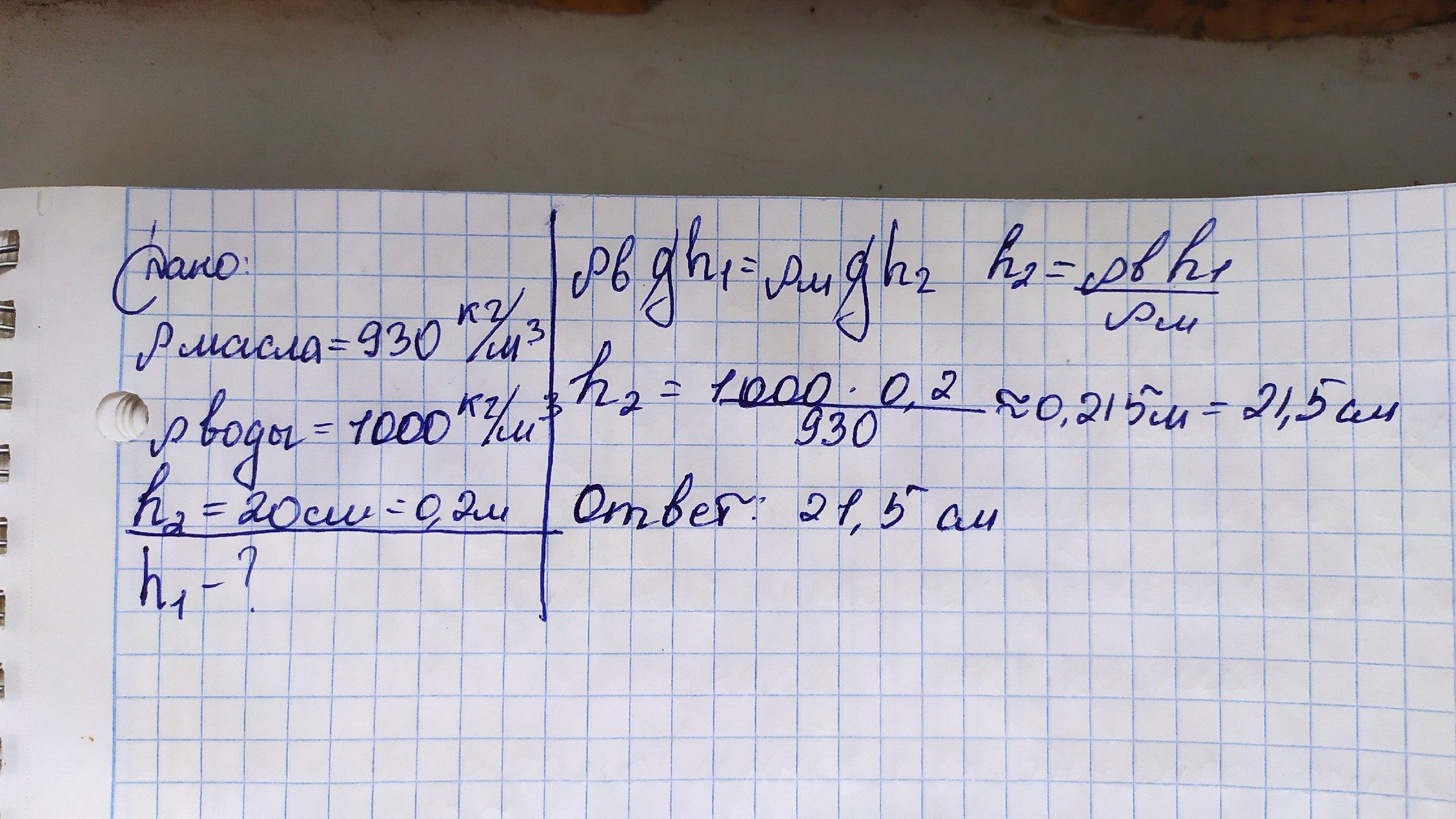 Высота столба воды 20 см. Вычислите высоту столба масла. Ответ дайте в см и только числом, округлив до целого числа.
