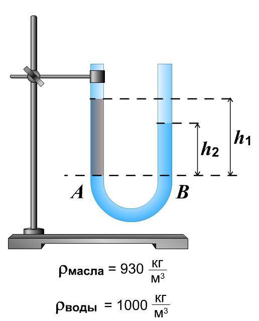 pв*g*h1=pм*g*h2 (Давление воды равно давлению масла)