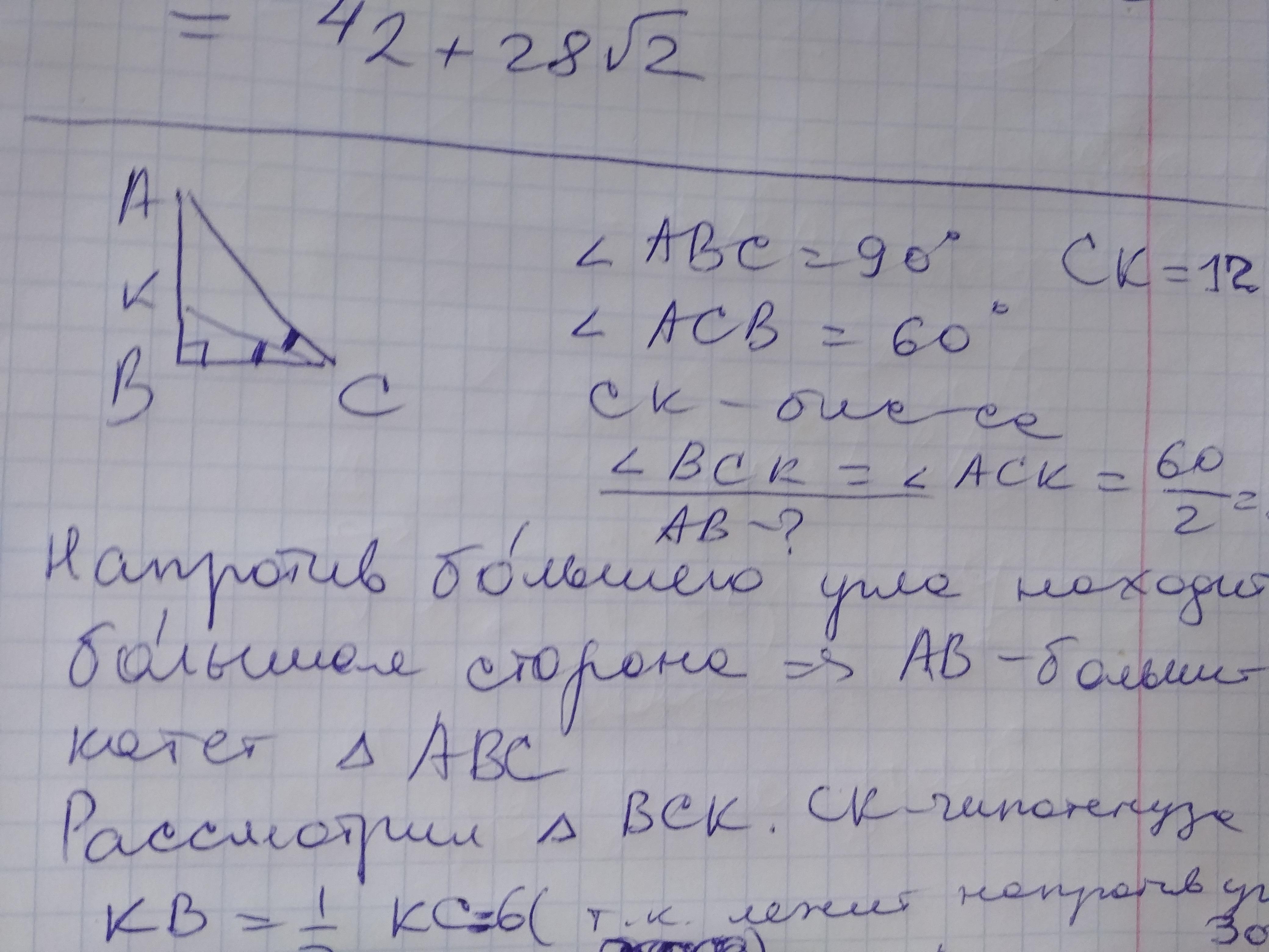 В треугольнике КСВ углы при основании АС одинаковые и равны 30 градусов, значит треугольник равнобедренный и АК=КС=12