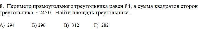 Периметр прямоугольного треугольника равен 84, а сумма квадратов сторон треугольника - 2450. Найти площадь треугольника.
