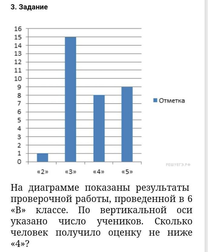 На диаграмме показаны результаты проверочной работы, проведенной в 6 «В» классе. По вертикальной оси указано число учеников. Сколько человек получило оценку не ниже «4»?