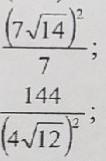 frac{(7sqrt{14})^2}{7} = frac{49 cdot 14}{7} = 7 cdot 14 = 98\frac{144}{(4sqrt{12})^2} =frac{144}{(8sqrt{3})^2}=frac{144}{64 cdot 3} = frac{48}{64} = frac{3}{4}= 0,75
