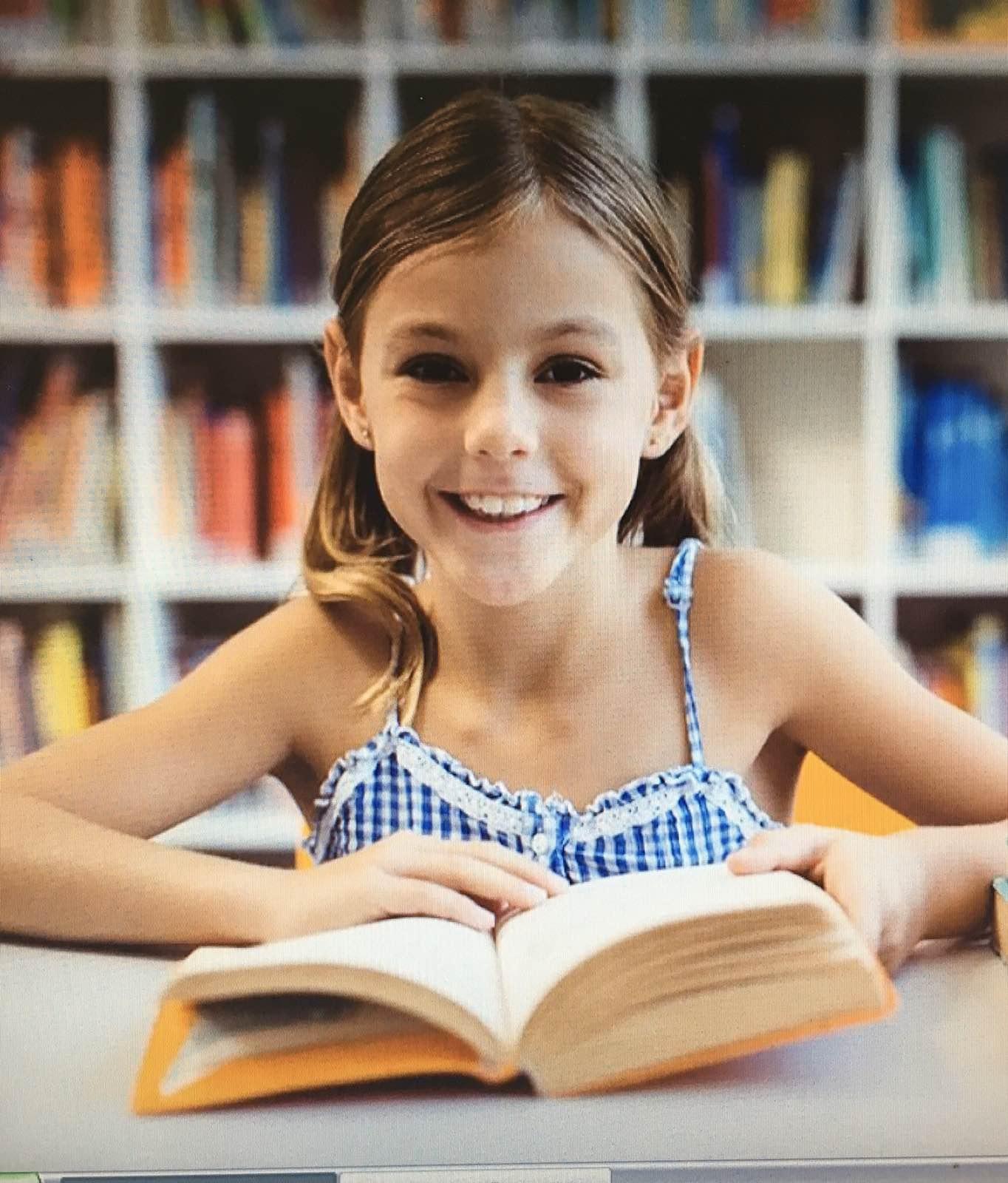На картинке изображена девочка с книгой. С виду ей 8-10 лет. Худенькая девочка в сине-белом сарафане в клеточку. Ровно уложенные волосы заплетённые в два хвостика. Волосы цвета брюнет. Сзади девочки расположена полка. На полке множество книг разных цветов. Девочка держит руками книгу с оранжевой оболожке. Наверное девочке нравится читать эту книгу. Ведь она улыбается.