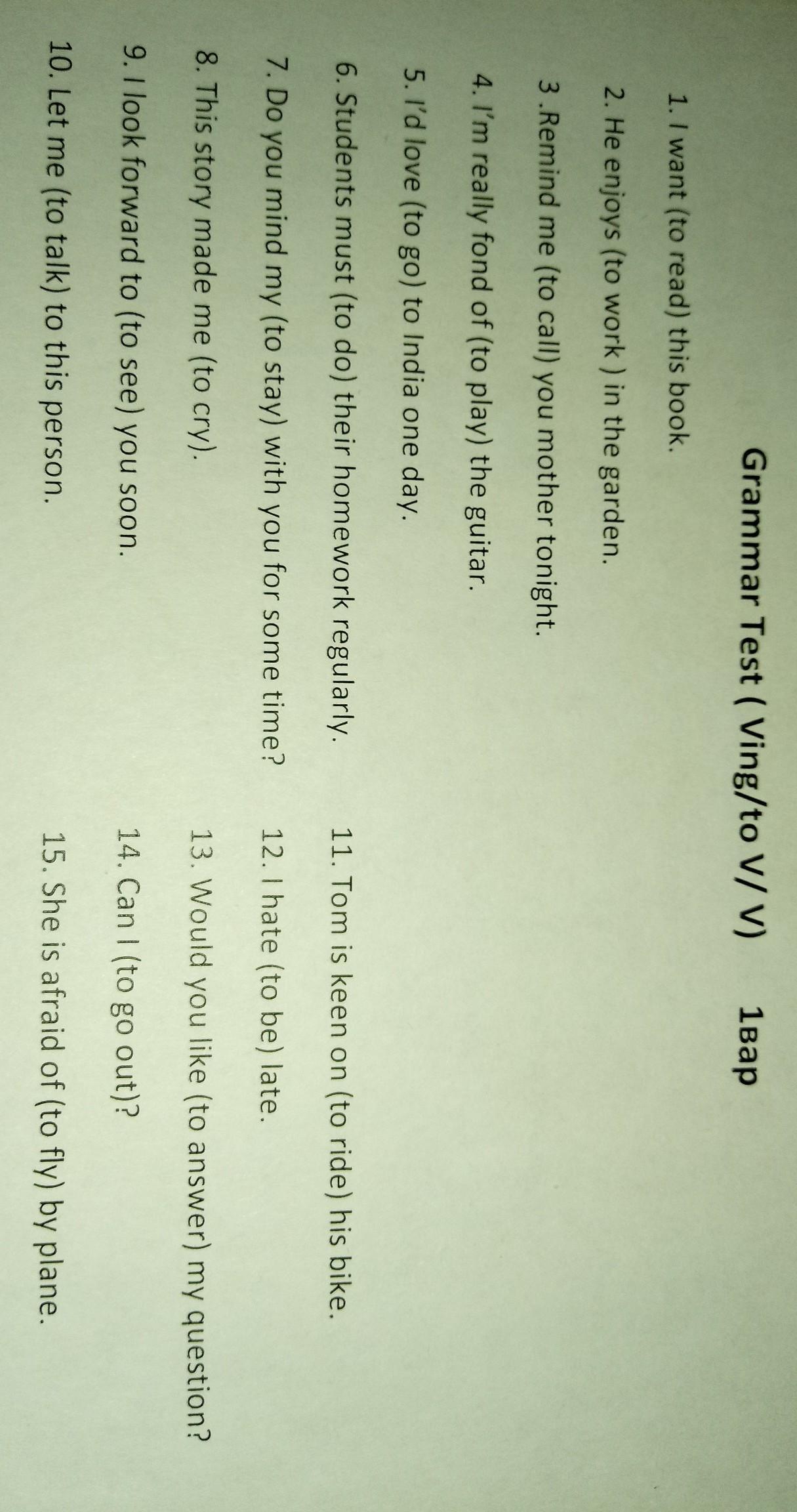 1. read. 2. working 3. to call 4. playing 5. to go 6. do 7. staying 8. cry 9. to see 10. talk 11. riding 12. being 13. to answer 14. go out 15. flying